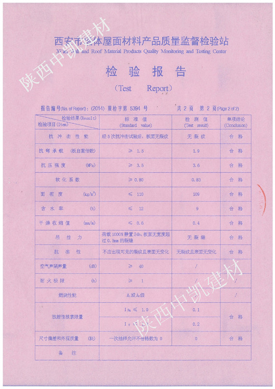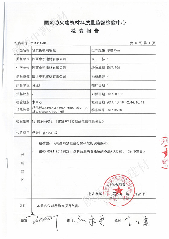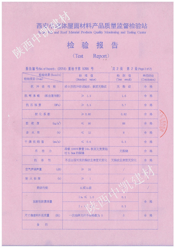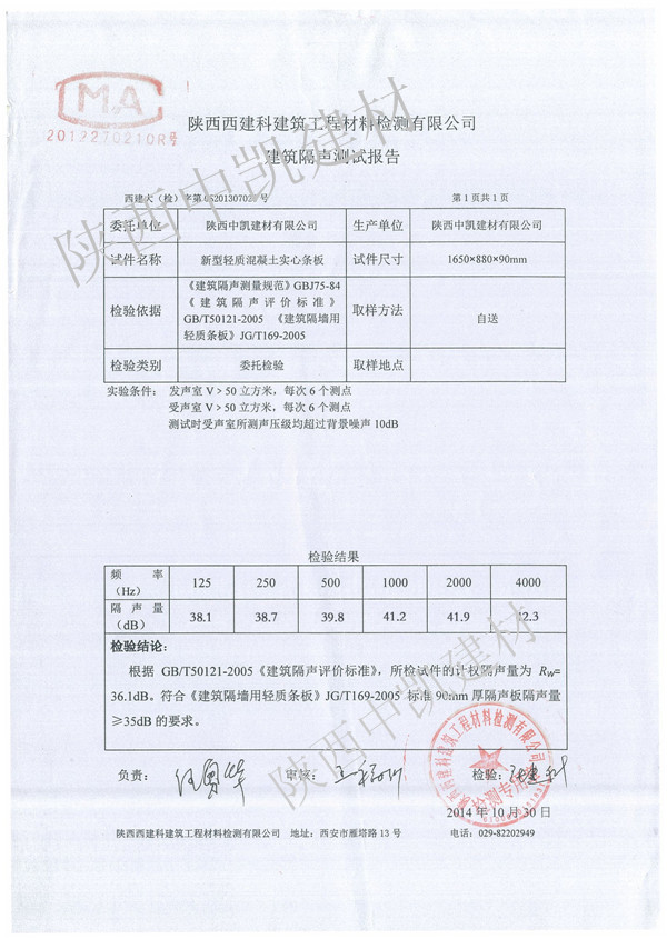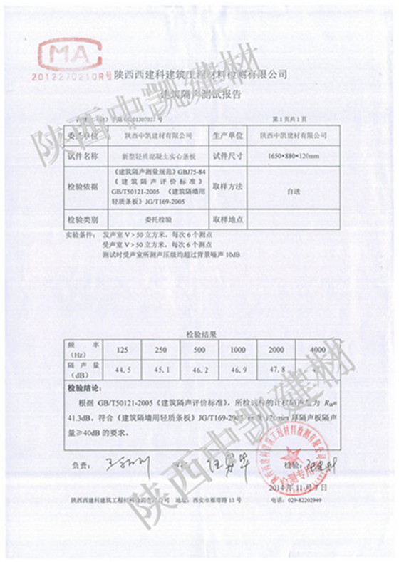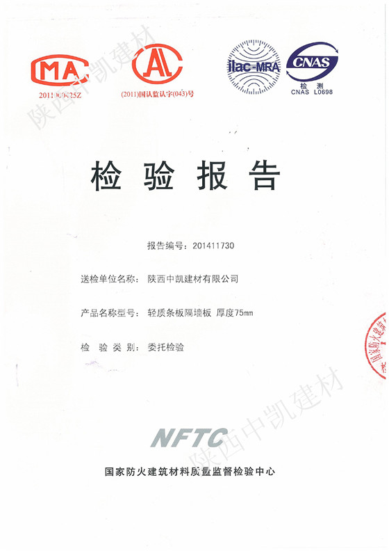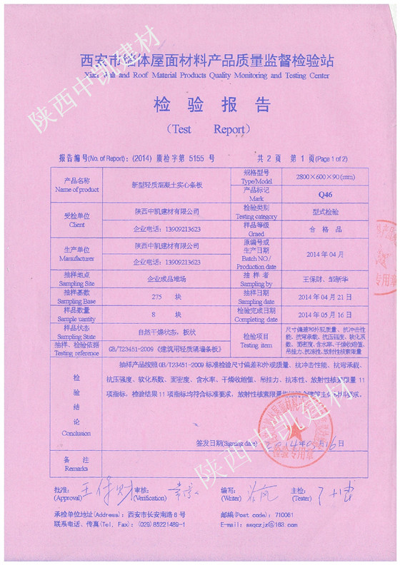 新型輕質(zhì)混凝土實(shí)心墻板檢驗(yàn)報(bào)告是由陜西中凱建材在2014年做的檢測(cè)報(bào)告